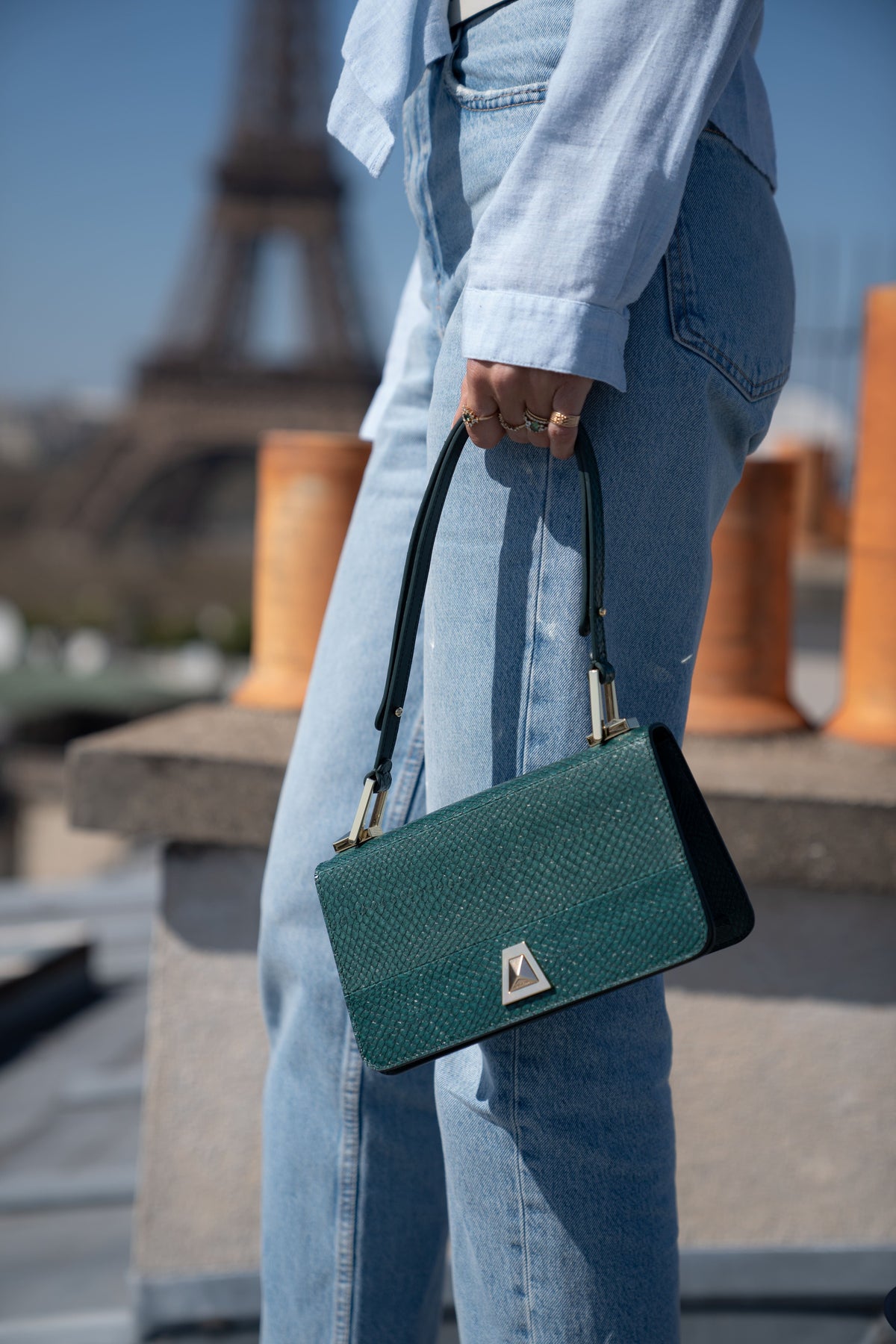 Le Paseo, baguette signature de Muntaner, incarne un luxe moderne inspiré du vintage. Son design urbain se distingue par des boucles joaillières élégantes et un cuir marin aux reflets uniques.