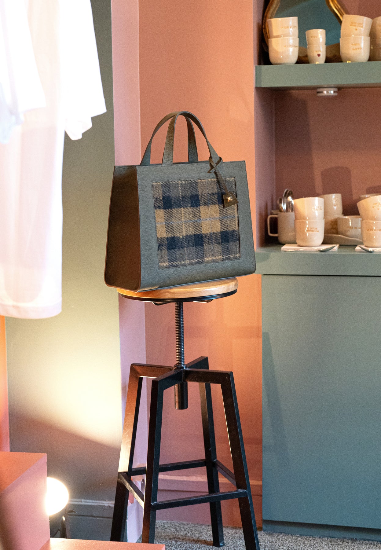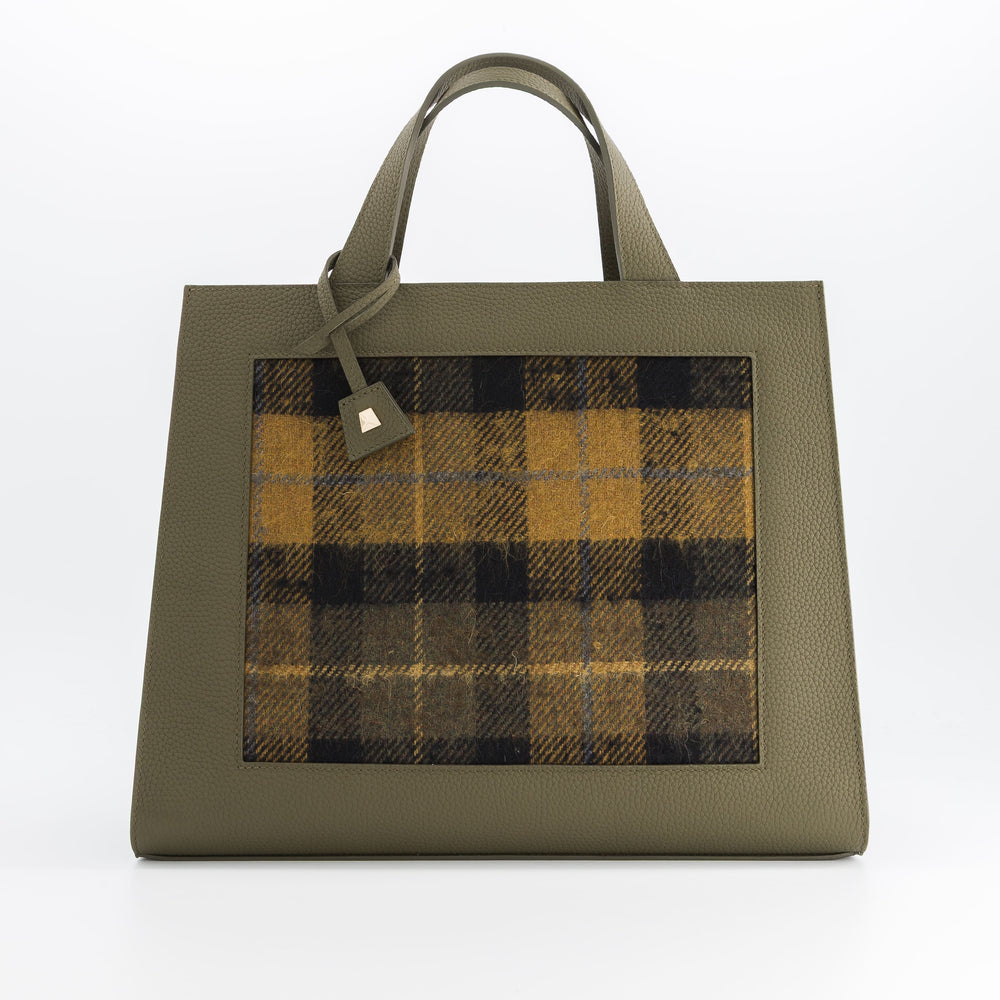 Son design en trapèze rappelle l'ADN géométrique de Muntaner. Son panneau se décline en tartan cashmere & mohair. Son cuir taurillon kaki grainé le place dans la tendance de l'automne.