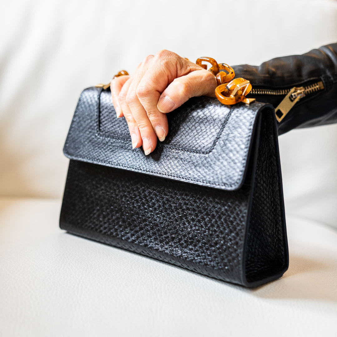 • Versions Noire, Rose, Ocean Turquoise: Cuir marin de saumon, tanné végétalement en provenance de tanneries françaises.